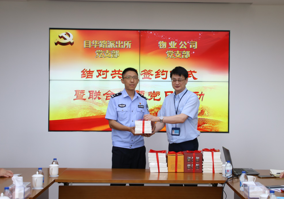 最后,结合“四史”学习教育,物业公司党支部向目华路派出所党支部赠送“四史”书籍,双方党员代表还围绕学“四史”和园区发展交流了学习体会。