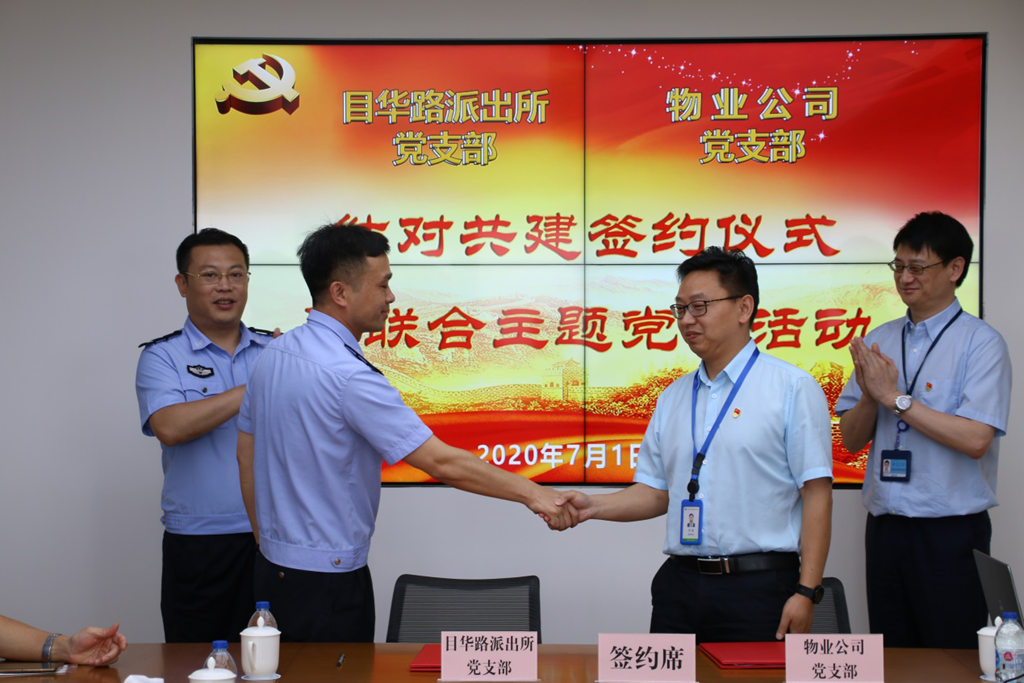 7月1日,在中国共产党99岁生日之际,化工分局目华路治安派出所党支部与物业公司党支部举行结对共建签约仪式暨联合主题党日活动。化工区公安分局总支委员、副局长李靓,企发公司党委书记、总经理林江见证签约并对双方结对共建提出殷切期望。