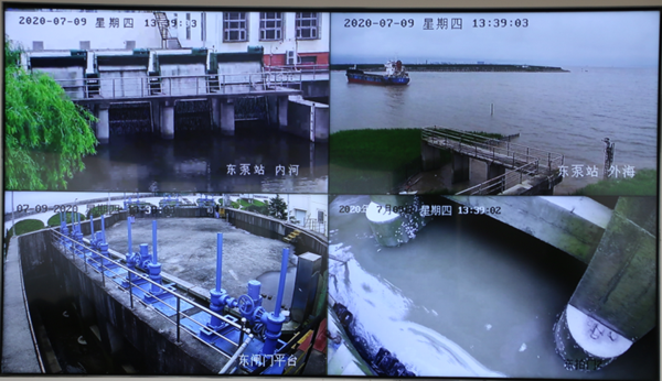 场景二:“泵站强排水作业”。受暴雨影响后,化工区东泵站防汛值班人员发现内河水位暴涨至警戒水位、外海持续高潮位,遂立即向演练策划小组汇报。演练策划小组通知东泵站采取预案措施。东泵站立即按照《防汛防台专项应急预案》要求,立即开泵强排水,降低内河水位,防止区内道路和企业厂区积水。
