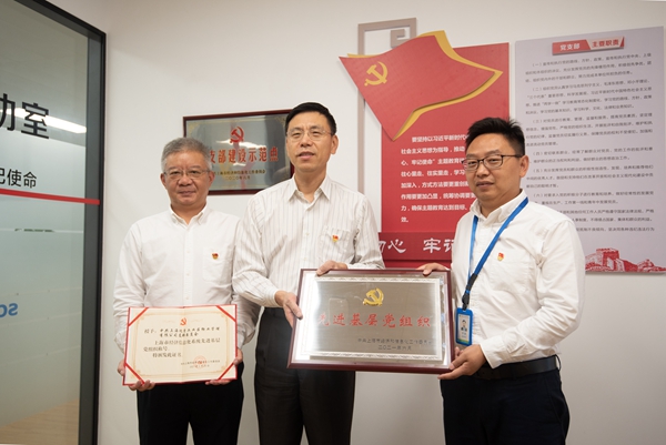 近日,在隆重庆祝建党100周年前夕,上海市经济和信息化工作党委决定,对100名优秀共产党员、100名优秀党务工作者及100个先进基层党组织予以表彰。其中,表彰名单中,公司党支部被授予“先进基层党组织”称号。6月30日,发展公司党委副书记郭盛来到公司,为荣获上海市经济和信息化工作党委“先进基层党组织”荣誉称号的公司党支部授牌,并勉励公司党支部持续保持优良传统,持之以恒以党建引领发展,巩固和发展党支部“服务与奉献”的个性特色党建服务品牌,打造一支乐于服务、敢于奉献的党员队伍,更好地发挥党员先进性,提升团队的战斗力和凝聚力,继续为发展公司系统党支部建设发挥示范引领作用和标杆作用。发展公司党群部有关人员参加。